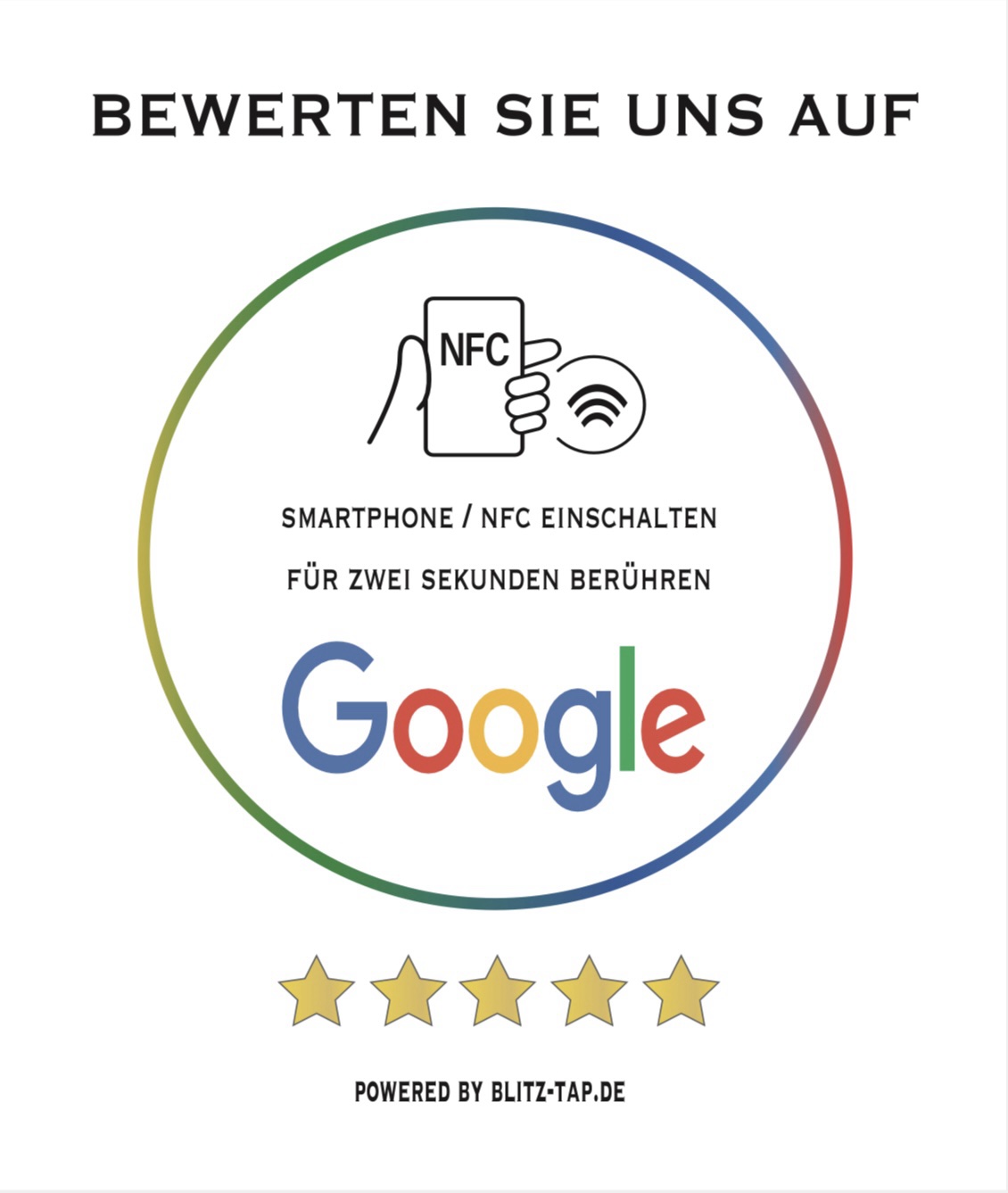Unsere NFC-Google-Aufsteller bieten eine innovative Möglichkeit, um Kundenfeedback zu sammeln. Durch einfaches Antippen gelangen Ihre Kunden direkt zu Ihrer Google-Bewertungsseite, was die Anzahl und Qualität der Bewertungen steigert. Verbessern Sie Ihre Online-Reputation und heben Sie sich mit dieser modernen Marketinglösung von der Konkurrenz ab!